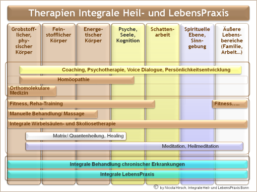 In der unten stehenden Grafik zeigen die Spalten die in der Integralen LebensPraxis allgemein betrachteten Bereiche. Die horizontalen Balken stellen die Therapien dar und ihren Wirkungsbereich innerhalb der Lebensbereiche. Dies ist mit der Länge und Position der Balken visualisiert. Weitere Erläuterungen zu Begrifflichkeiten in den Spalten finden Sie hier.
